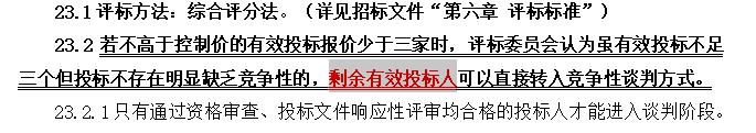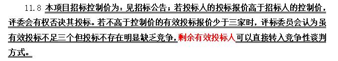 若不高于控制价的有效投标报价少于三家时,评标委员会认为虽有效投标不足三个但投标不存在明显缺乏竞争性的,剩余有效投标人可以直接转入竞争性谈判方式。具体修正位置为: